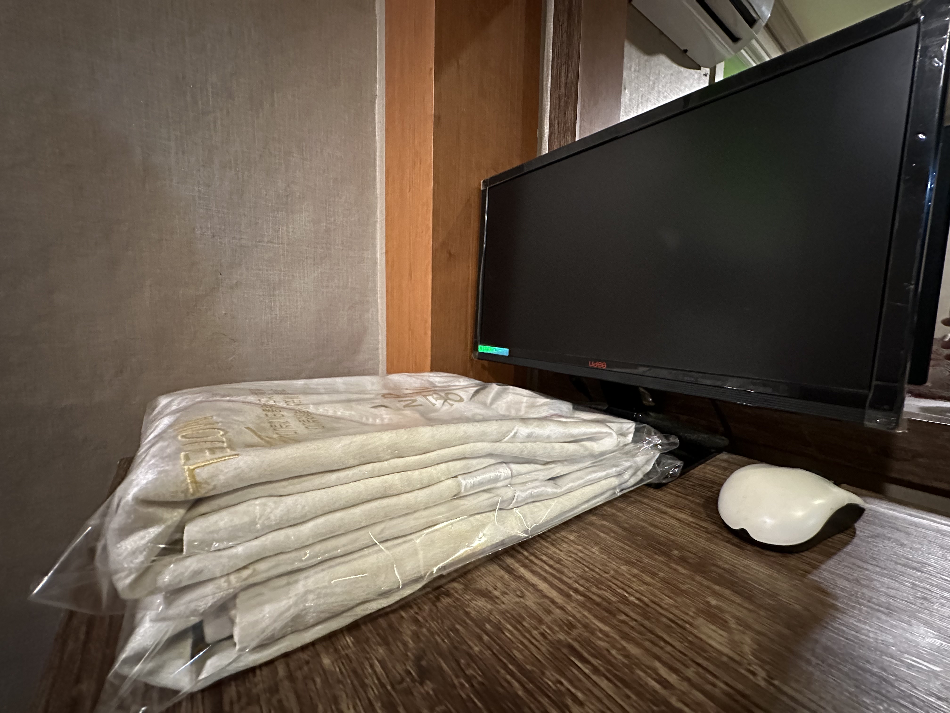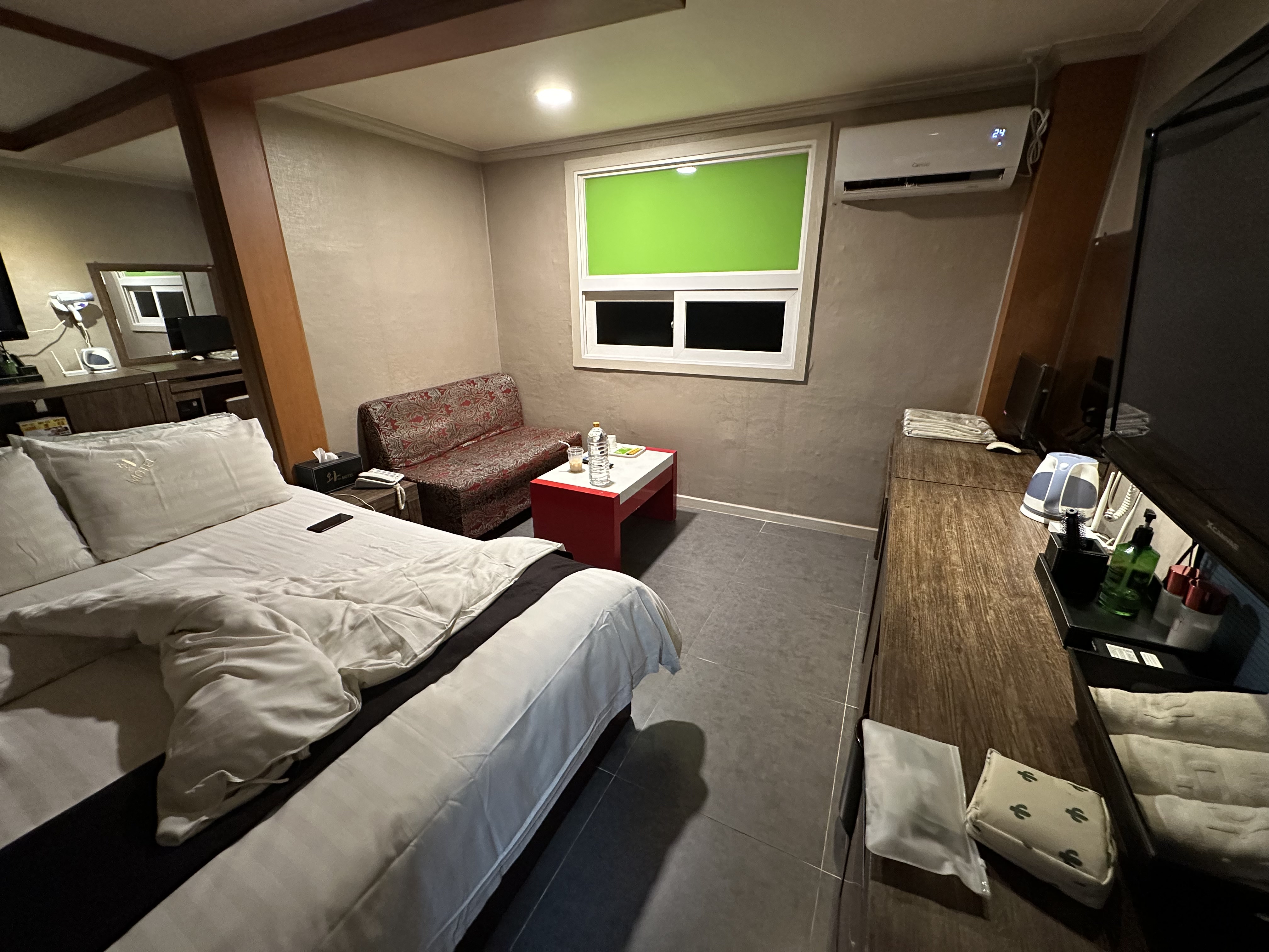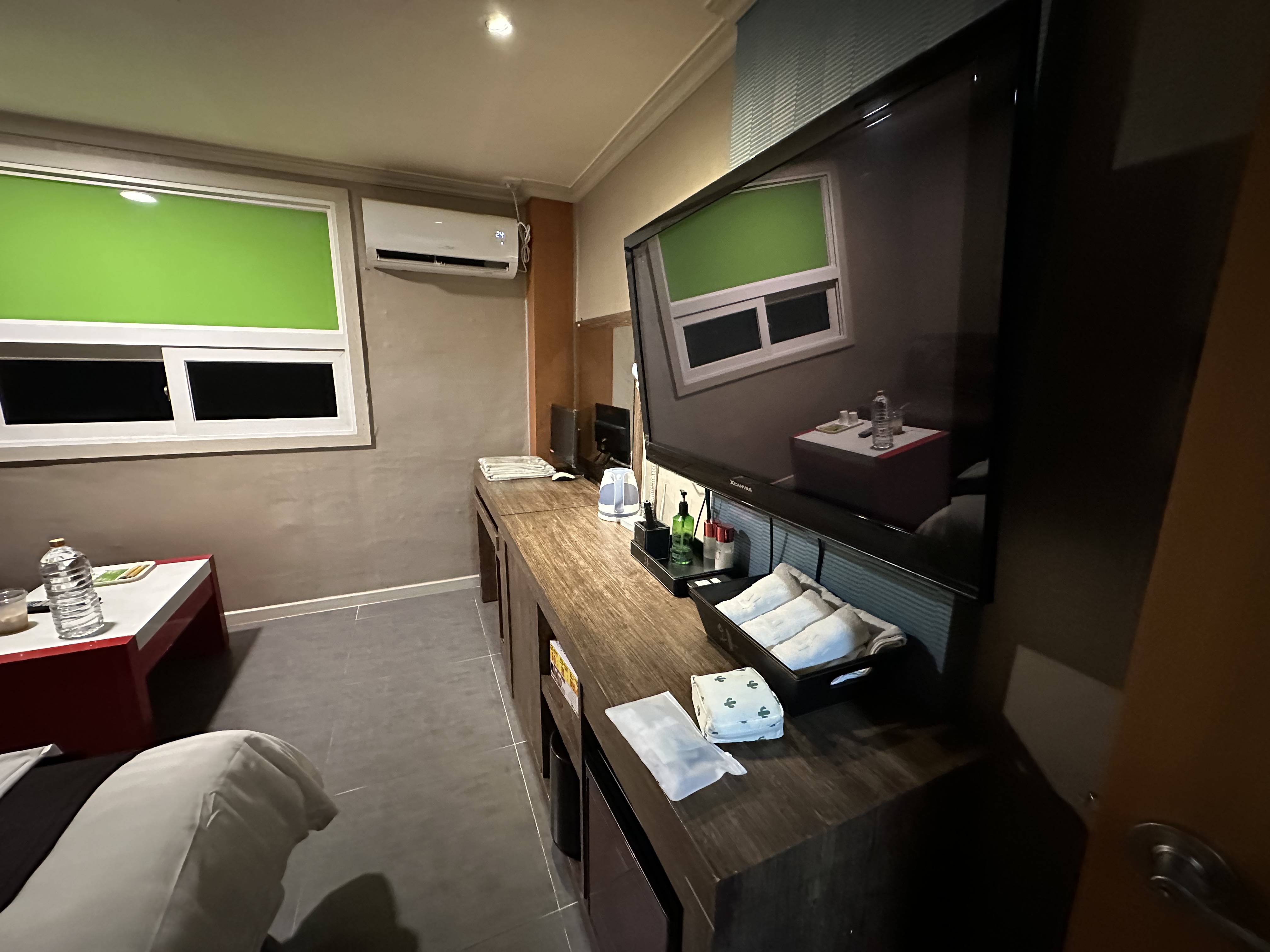 객실의 느낌은 딱 요런 모습 입니다 물론 가지런했지만~ 제가 침대에 살짝 앉아서 ㅠ 이렇게 조금 커버가 들쳐 올라간 점 양해 부탁 드립니다 부족한거 없이 뭐 있을거 다 있고, 우리나라 동네 모텔 느낌이랑 다를바 없습니다 제가 이날 약 3만원 정도에 예약을 했는데~ 요즘에 이런 가격이 없습니다만~ 이날 공항 근처에서 가장 위치도 저에게 적당하고, 암튼 여기에서 하루 묵었습니다