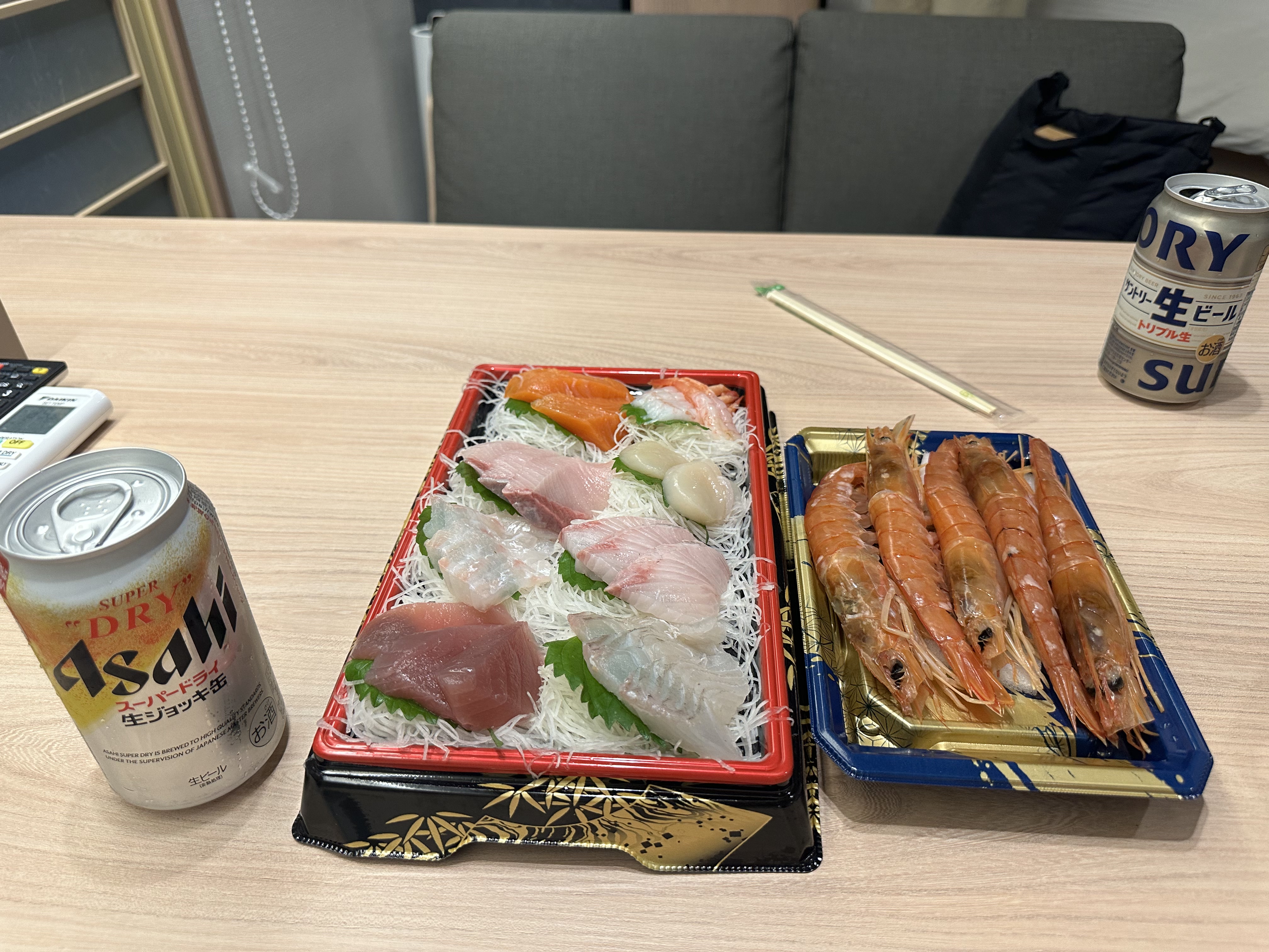 맥주한캔 까고, 회랑 새우랑 이것저것 차려서 먹어봅니다~ 맛이 아주 훌륭 합니다 그리고 이렇게 다양하게 사왔음에도 가격이 참 저렴 합니다~ 일본 은 이런 생활 물가가 참 저렴해서 좋은 것 같습니다