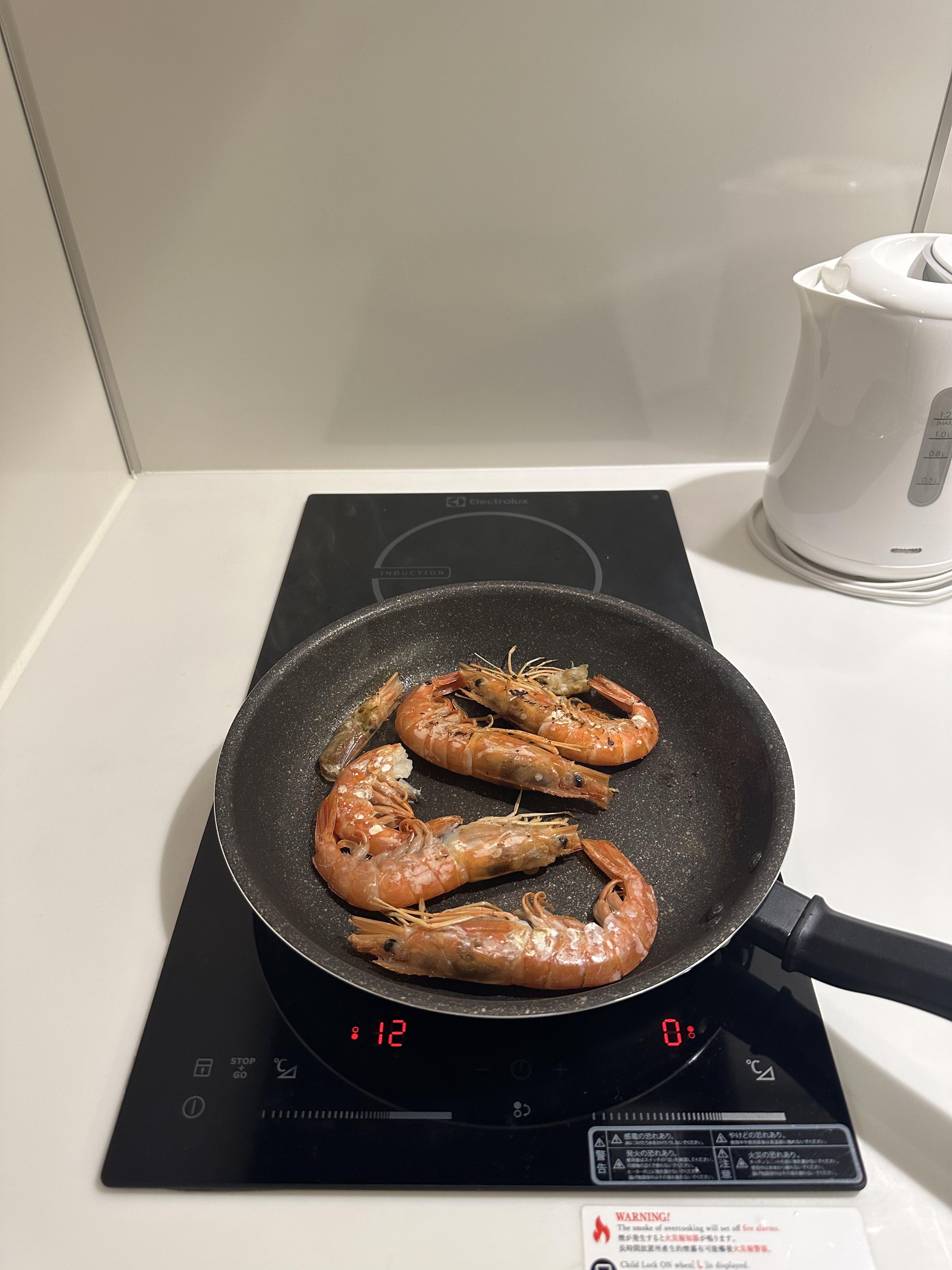 아직 조리 전의 새우 입니다만~ 아주 신선 해 보입니다~ 횟감으로도 먹을 수 있지만~ 혹시 몰라서 익혀서 먹고자 인덕션을 켜 보았습니다~ 미마루 호텔 은 오사카 에서 상당히 평이 좋은 호텔 입니다~ 그리고 사진 처럼 이런 회를 가져와서 또는 고기를 사서 장을 봐서 호텔 에서 조리를 해서 먹을 수 있기때문에 큰 장점이 있습니다