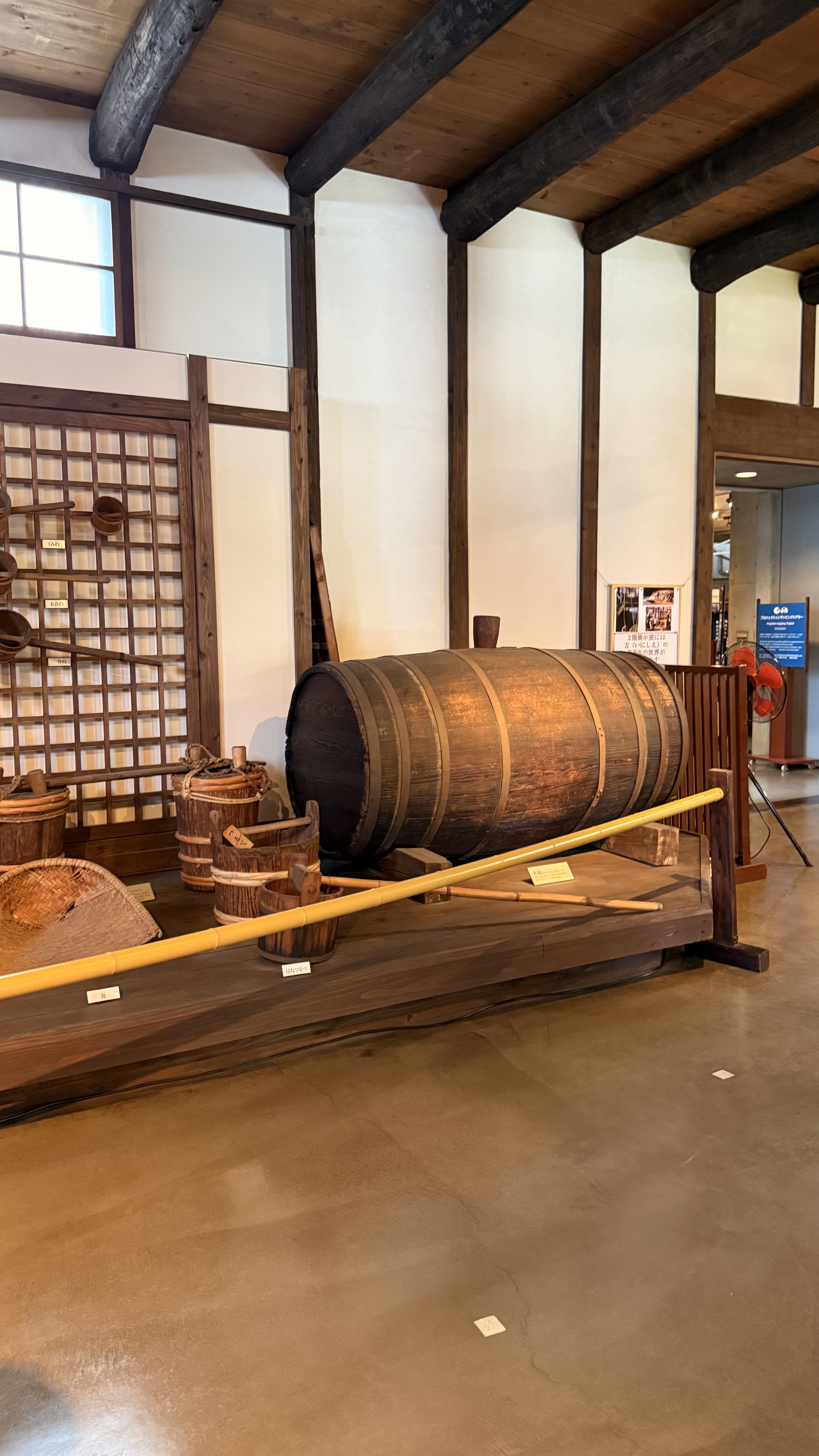 자료관은 예전 실제 양조장을 개조하여 만든 곳으로, 들어서는 순간부터 시간여행을 하는 듯한 기분이 들었습니다. 건물 내부에는 거대한 나무 통, 곡물을 씻고 발효시키던 도구들, 술을 걸러내던 천과 같은 도구가 고스란히 전시되어 있었습니다.