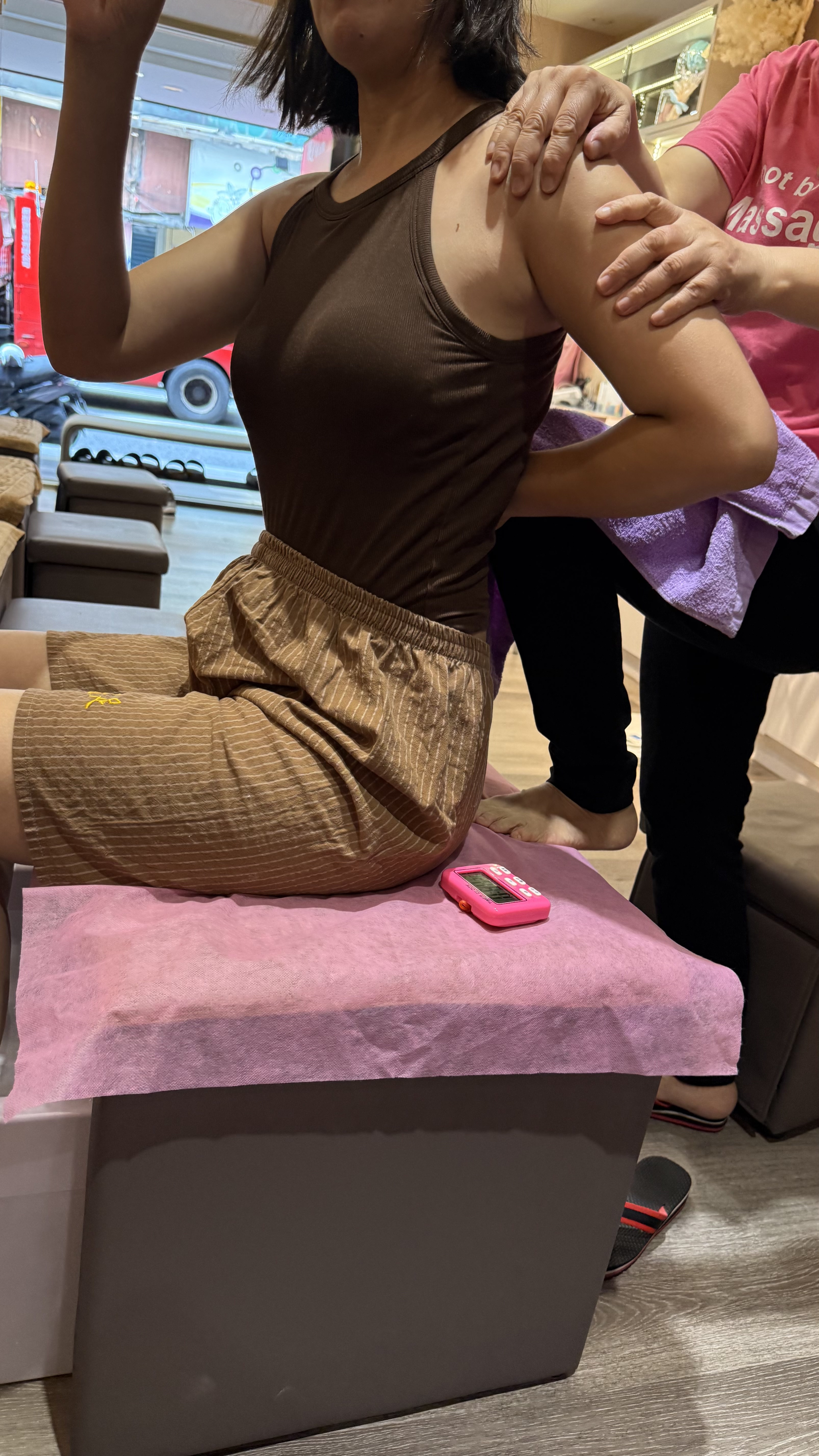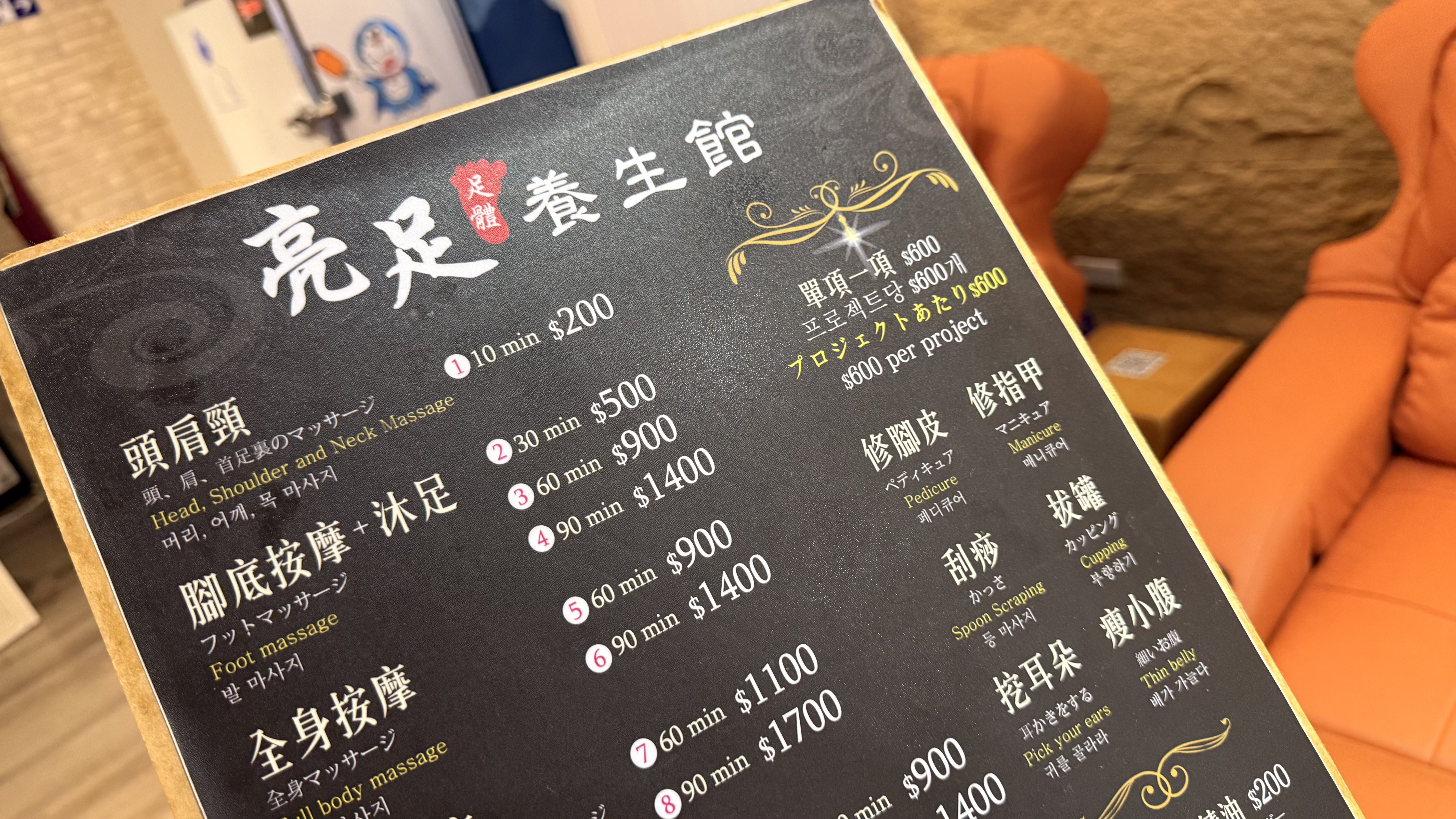 가게 내부는 깔끔하고 조용했으며, 조명도 은은하게 낮춰져 있어 피로가 풀리는 환경이었습니다. 직원분들은 기본적인 영어 소통이 가능해서 메뉴 선택이나 시간 조율에 어려움이 없었어요. 마사지사는 숙련된 손길로 압을 조절해주었고, 특히 발바닥 지압 포인트를 잘 잡아줘서 여행 피로가 사라지는 느낌이었습니다.