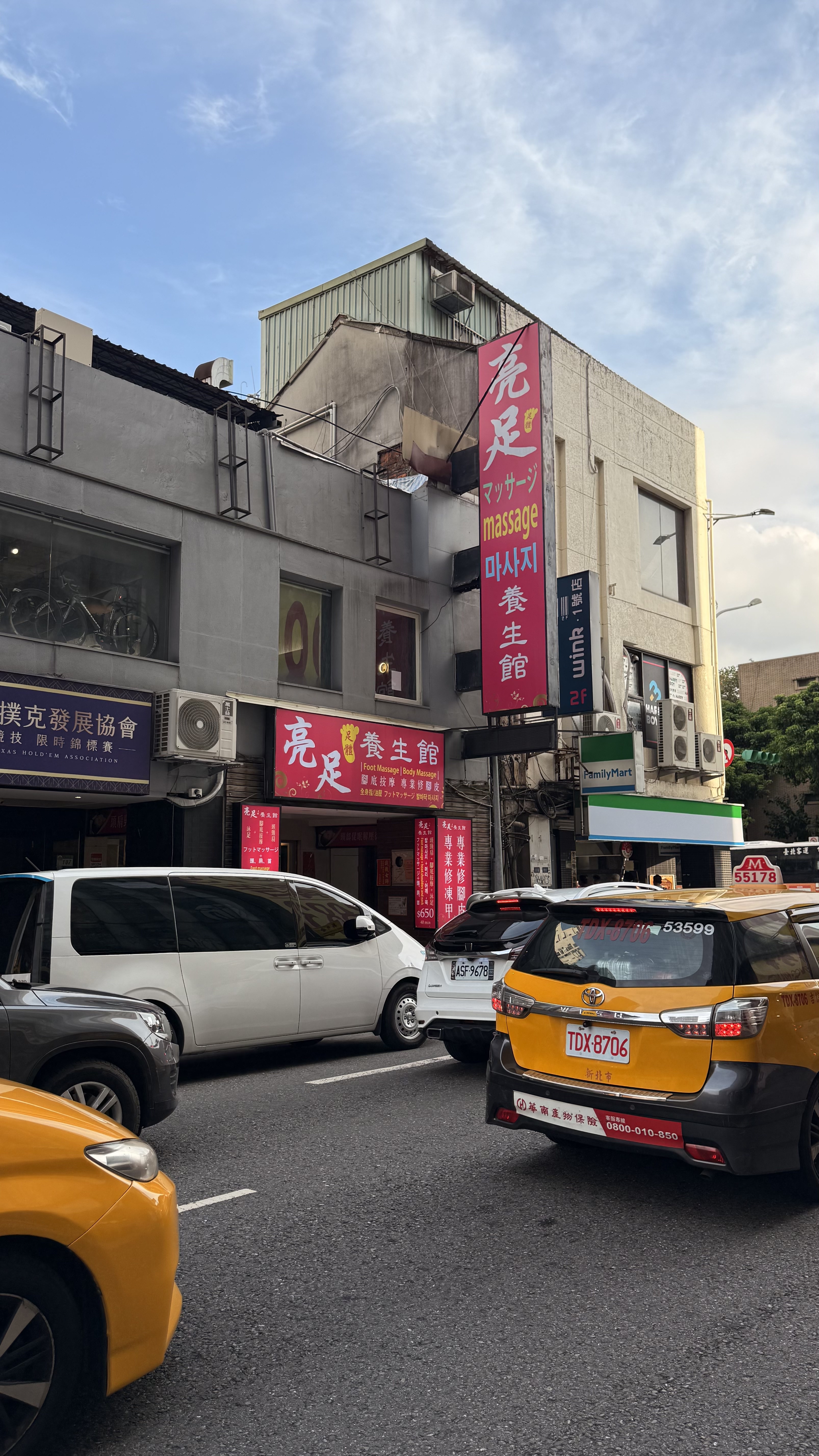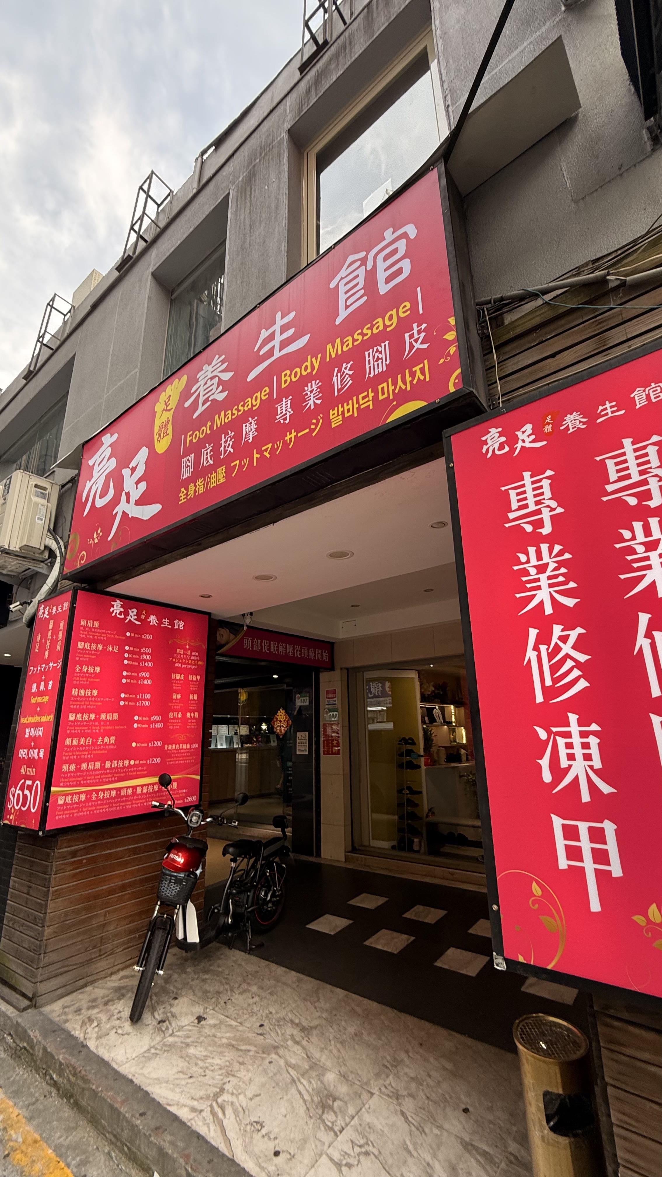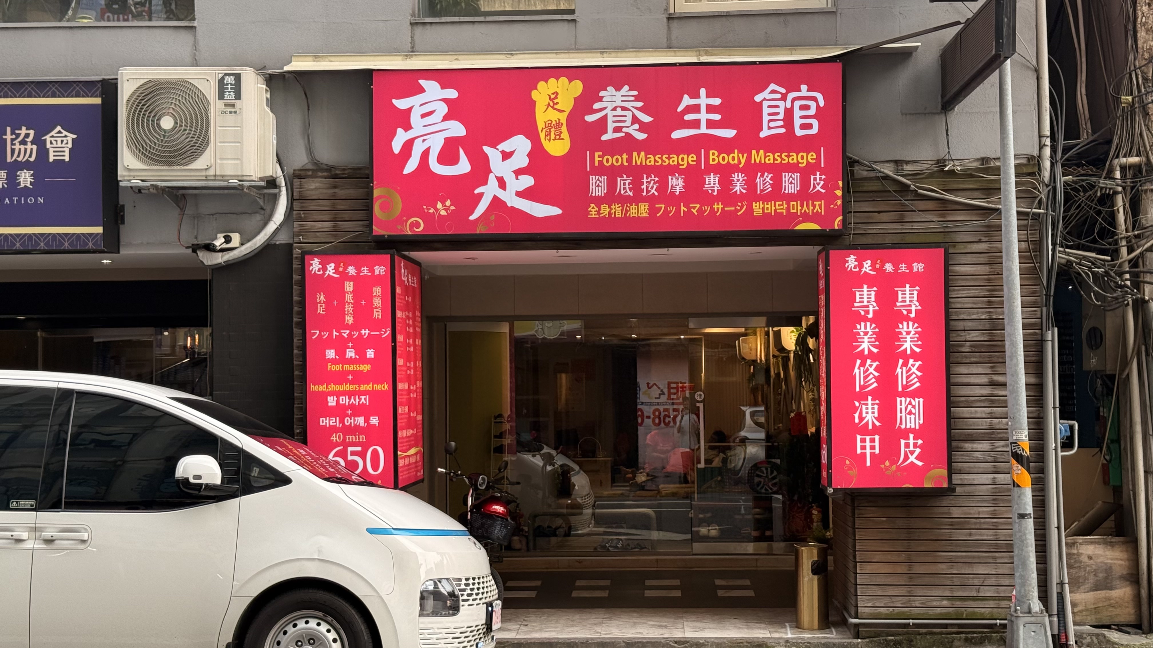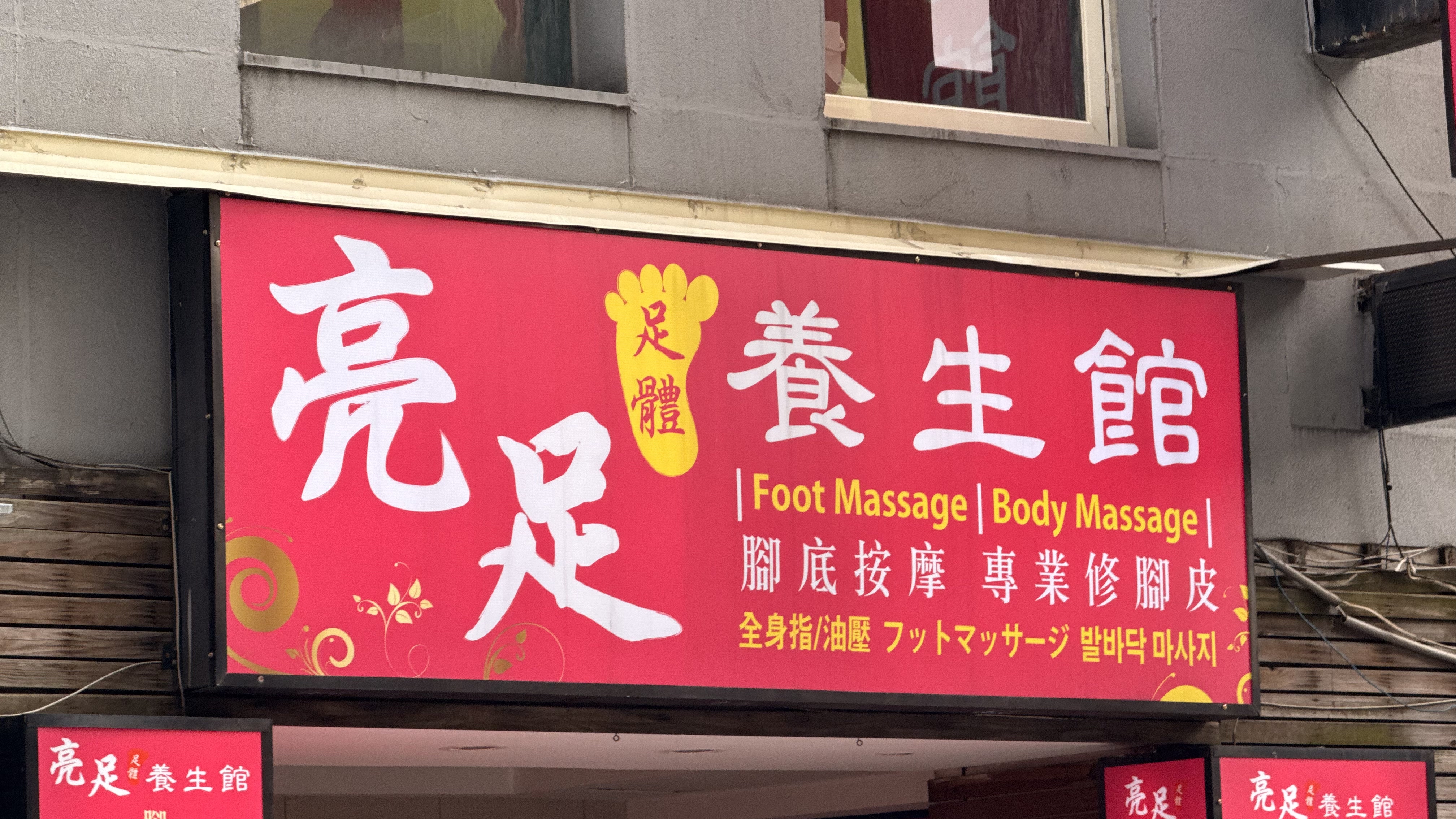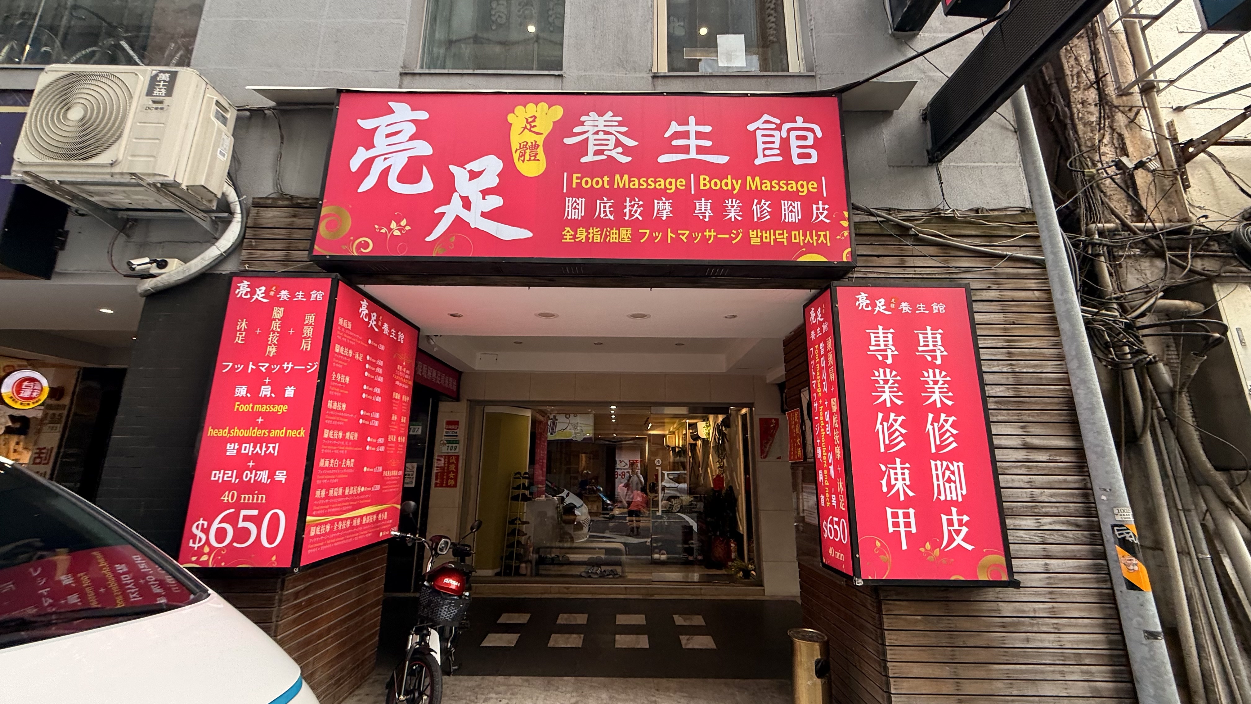 벽에는 ‘腳底按摩 / 全身按摩 / 頭療 / 修腳皮’라는 문구가 적혀 있고,