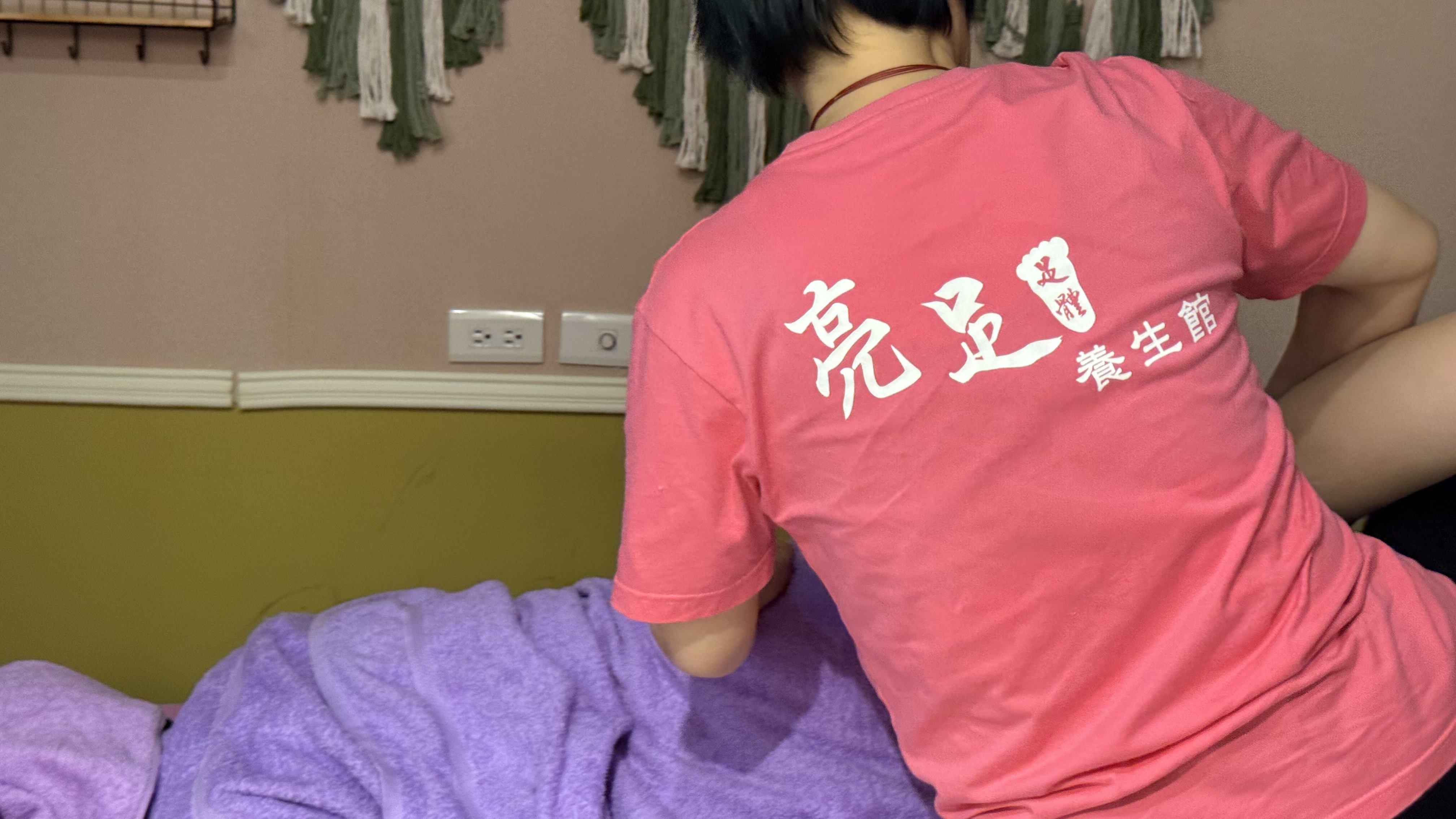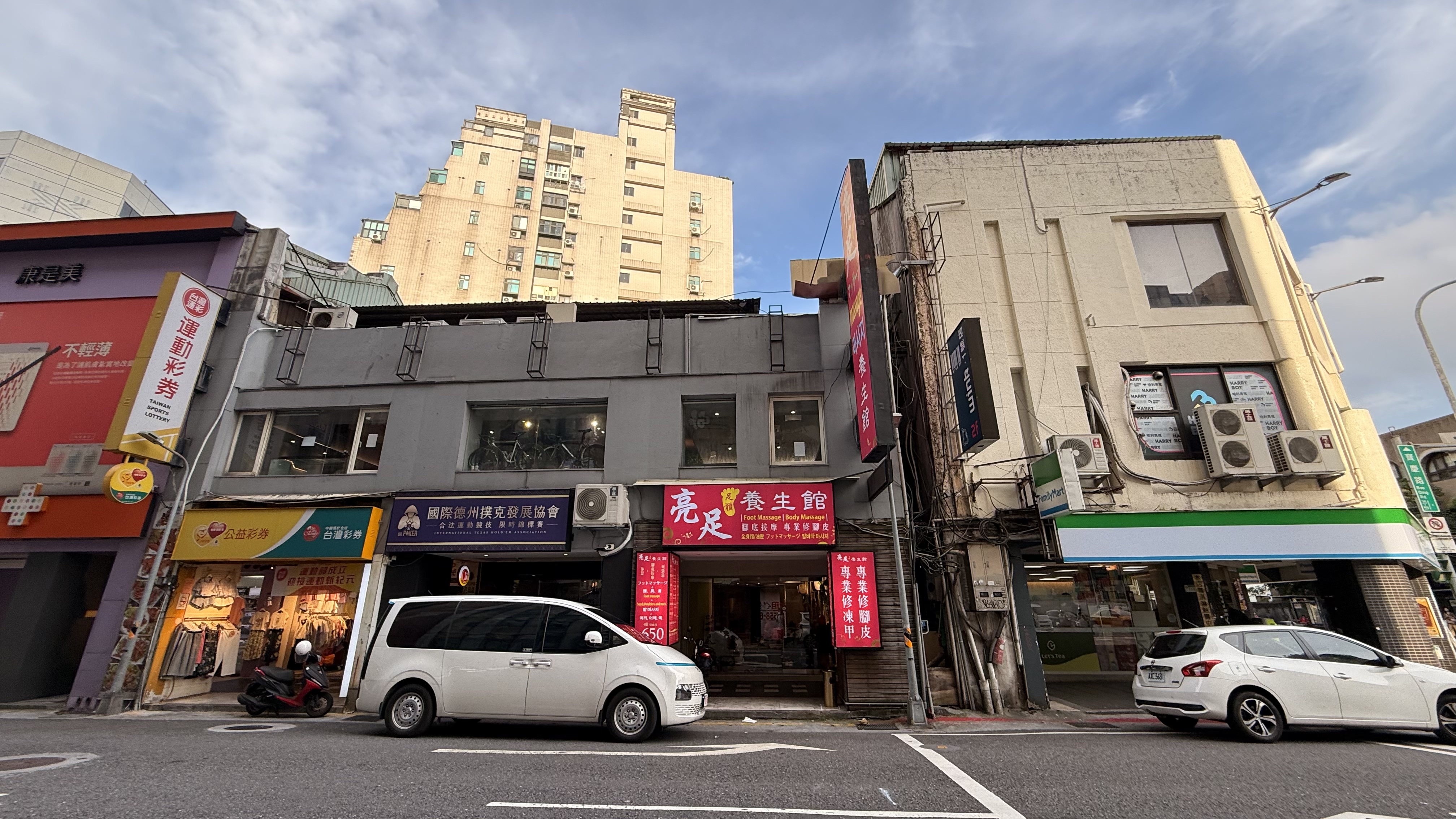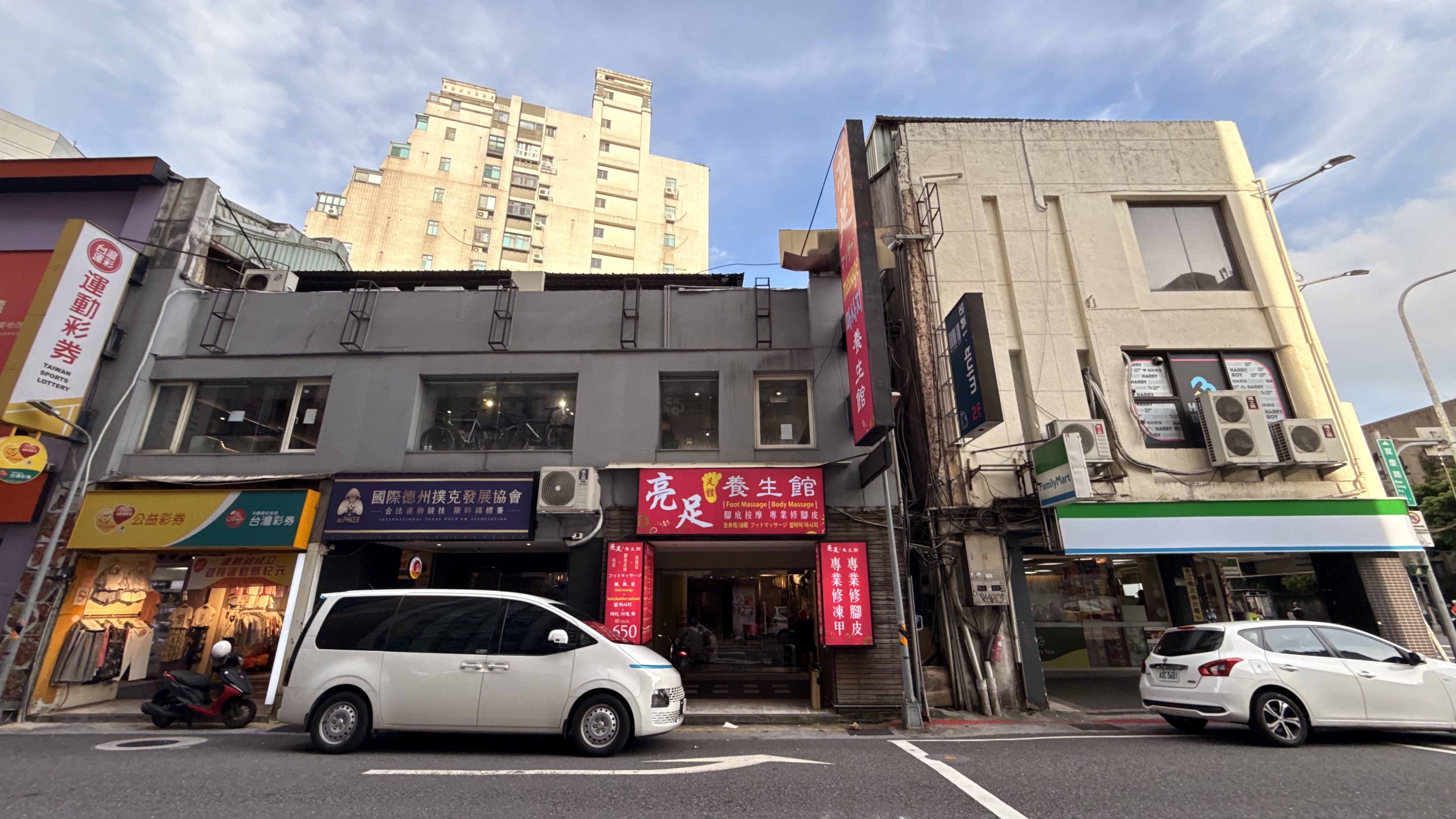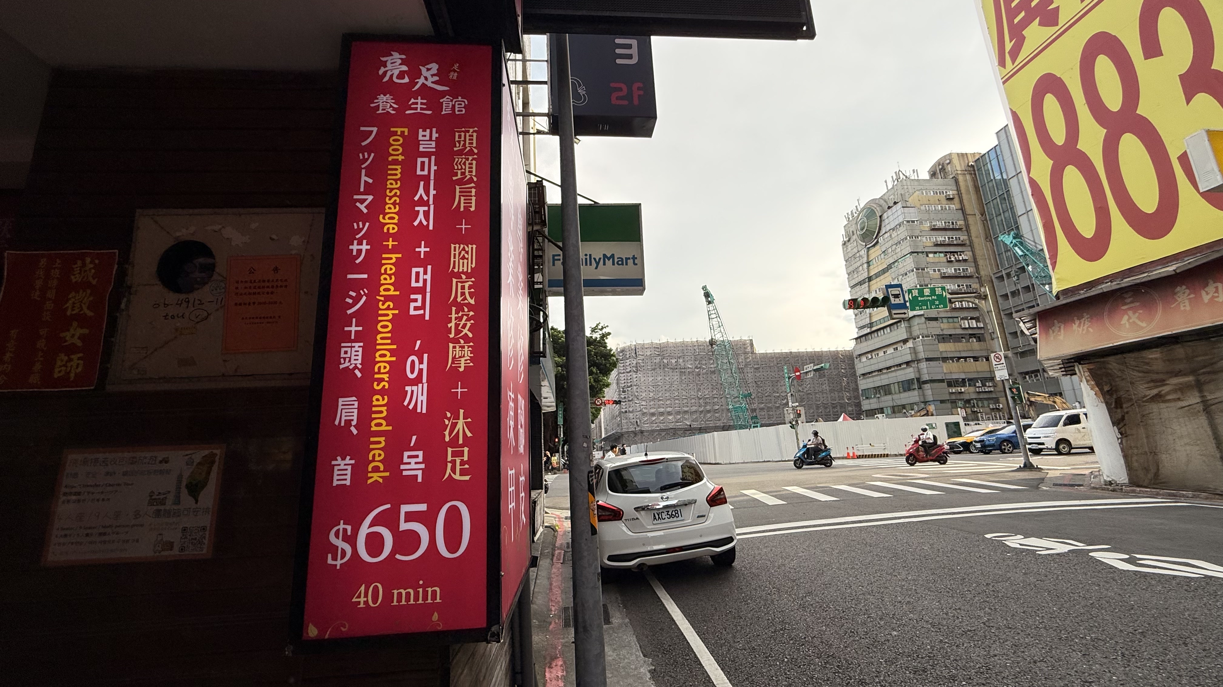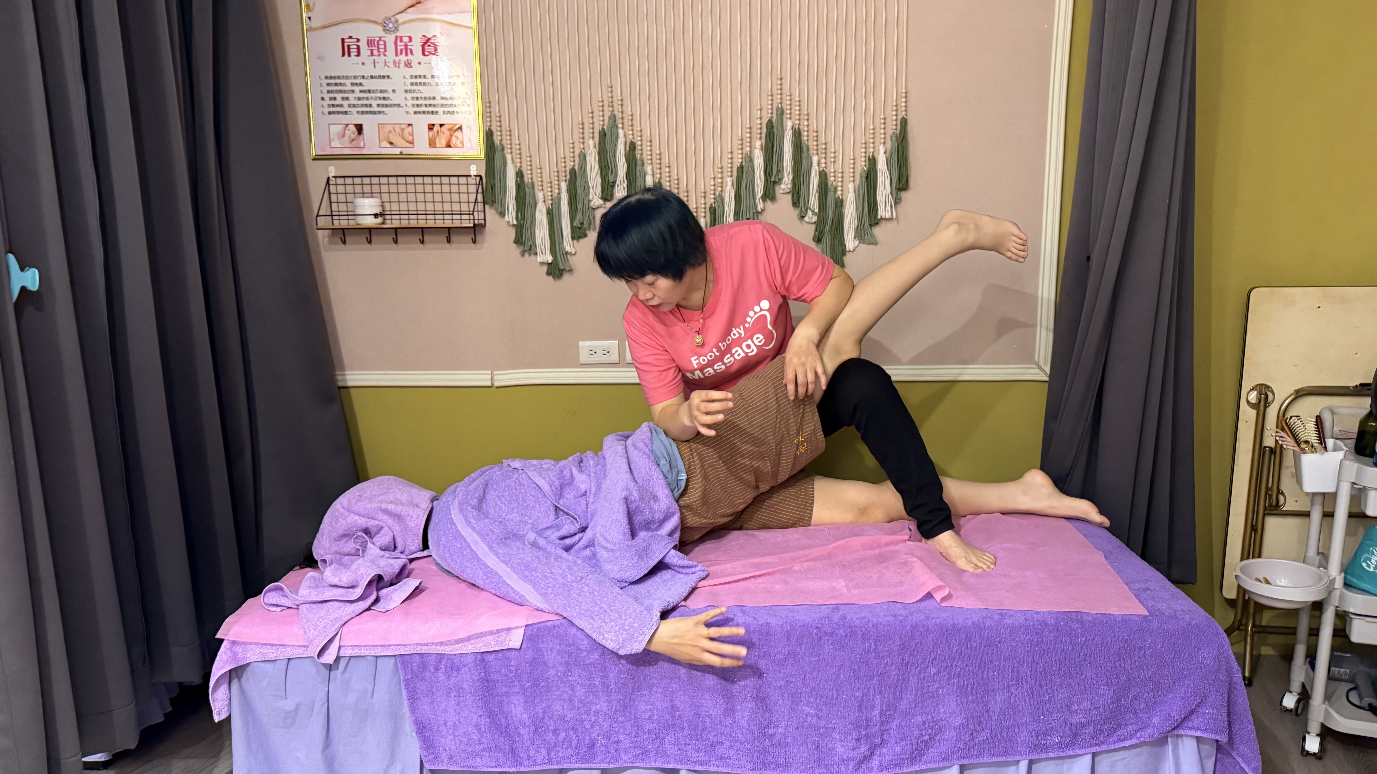 벽에는 ‘腳底按摩 / 全身按摩 / 頭療 / 修腳皮’라는 문구가 적혀 있고,