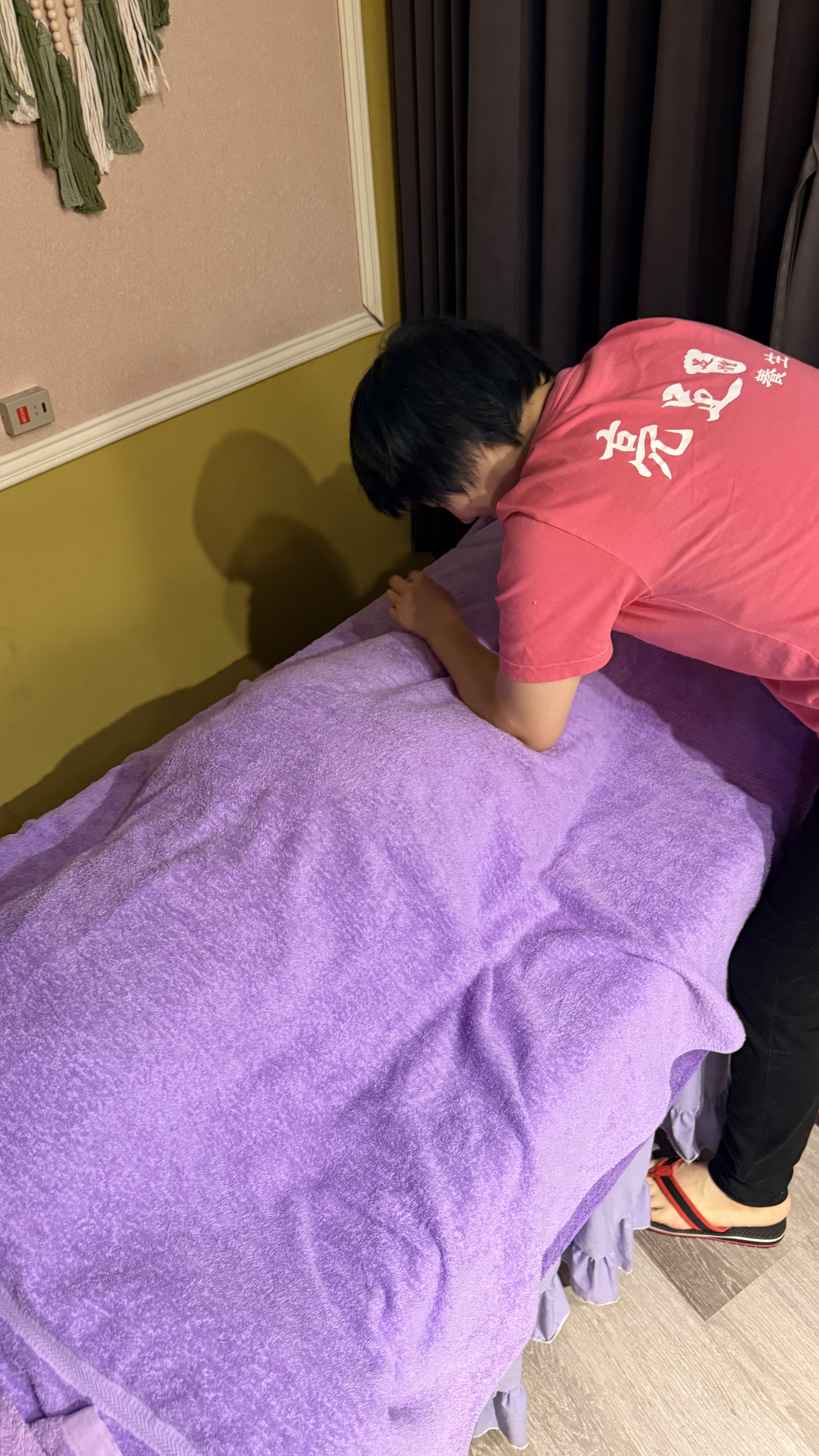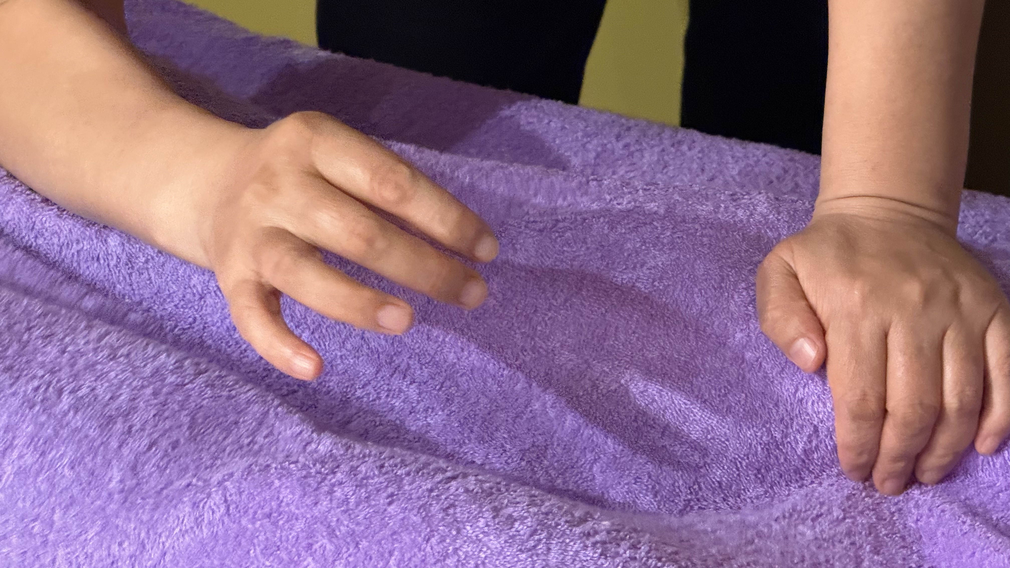 마사지 후 따뜻한 수건으로 몸을 감싸는 마무리 과정이에요.