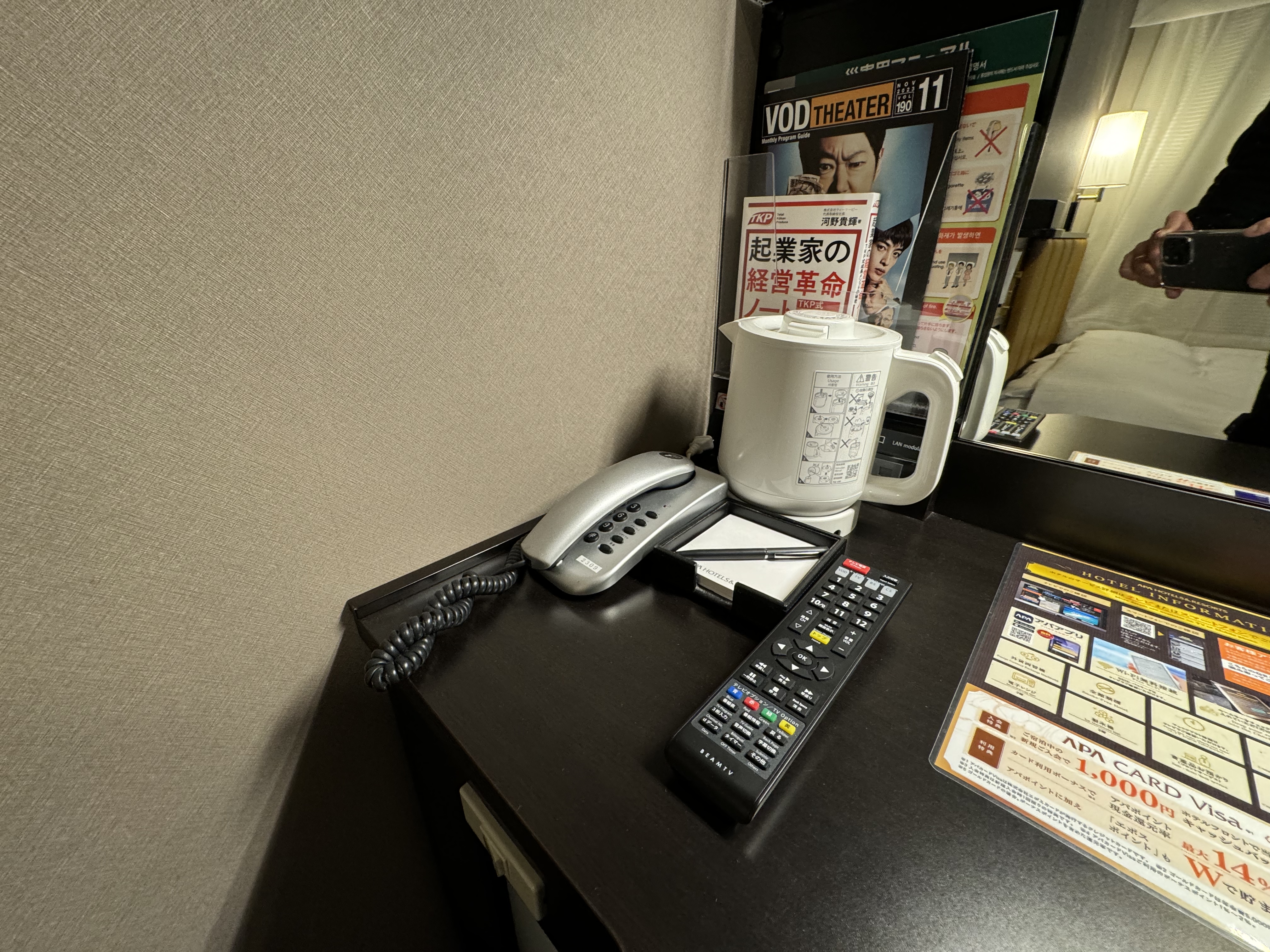 그리고 객실당 물이 2병 제공되고, 커피포트도 있습니다~ 도쿄 자유여행 즐기면서 부족함이라고는 1도 없는 아주 편하고, 좋은 시설의 호텔 입니다~ 다만 아까 서론에서 말씀 드린 대로~ 저도 잘은 자세히는 모르지만^^ 워낙 극우성향이 강한 호텔 체인이라고 했기에 ㅠ 그점이 조금 아쉬운 부분 입니다~