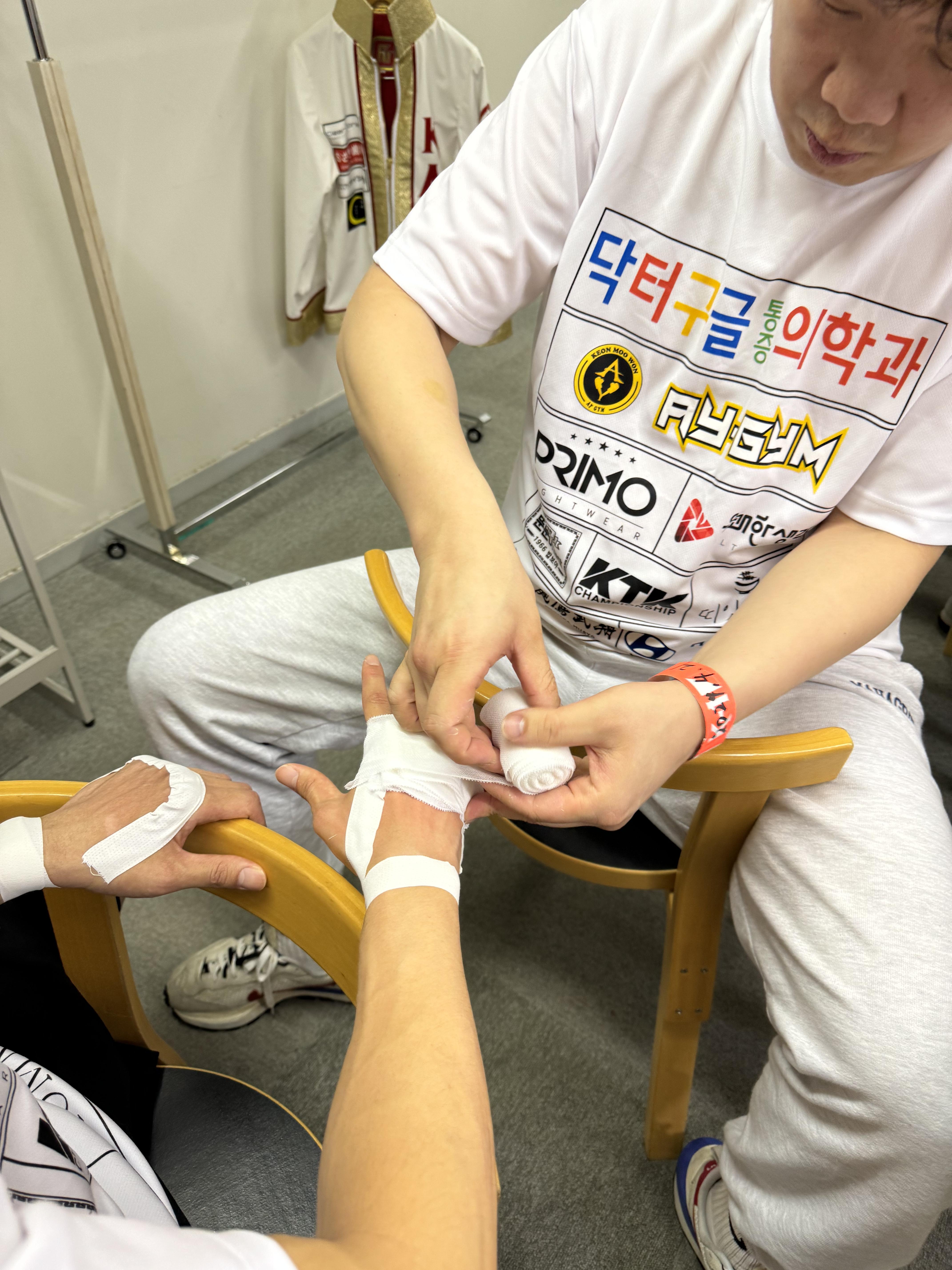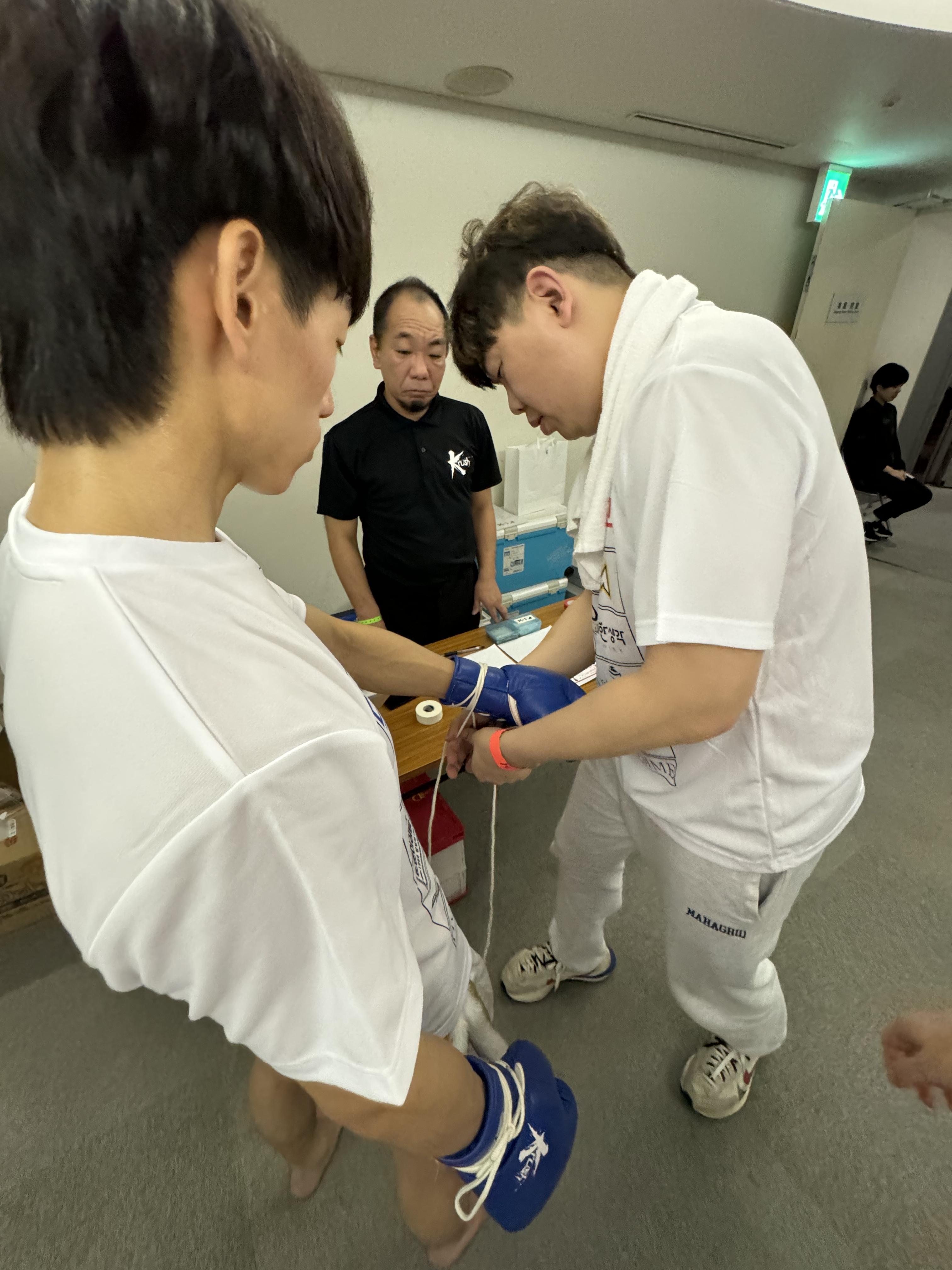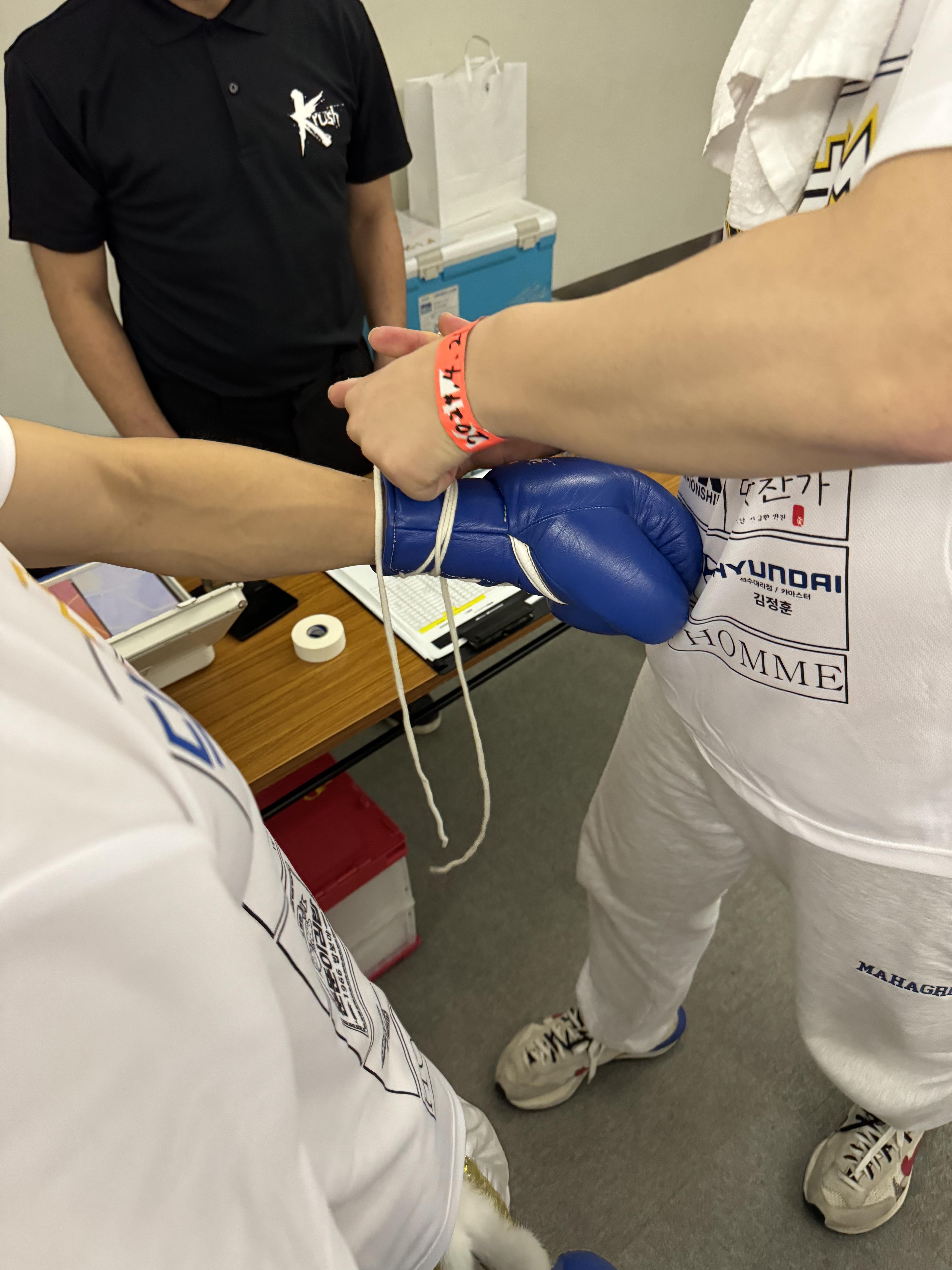 글러브 는 케이원에서 제공 된 글러브를 착용해야 하고, 혹시 모르게 테이핑 때문에 부상을 입히거나 부상을 당할 수 있기에 철저하게 심판이 사전에 검열하는 모습도 상당히 흥미로웠습니다