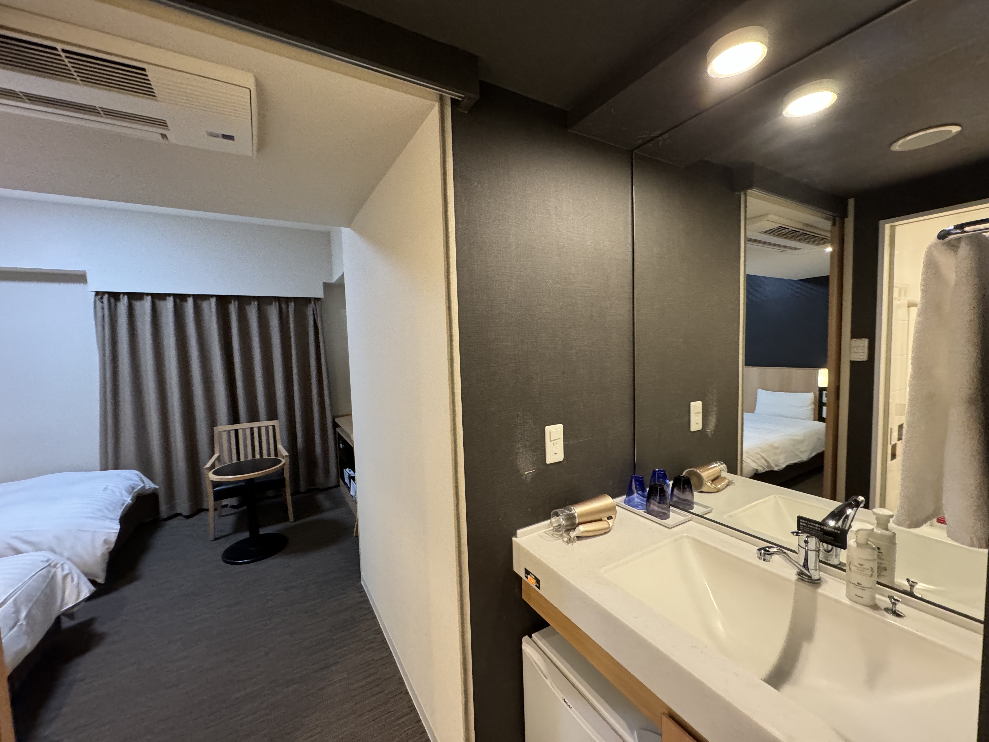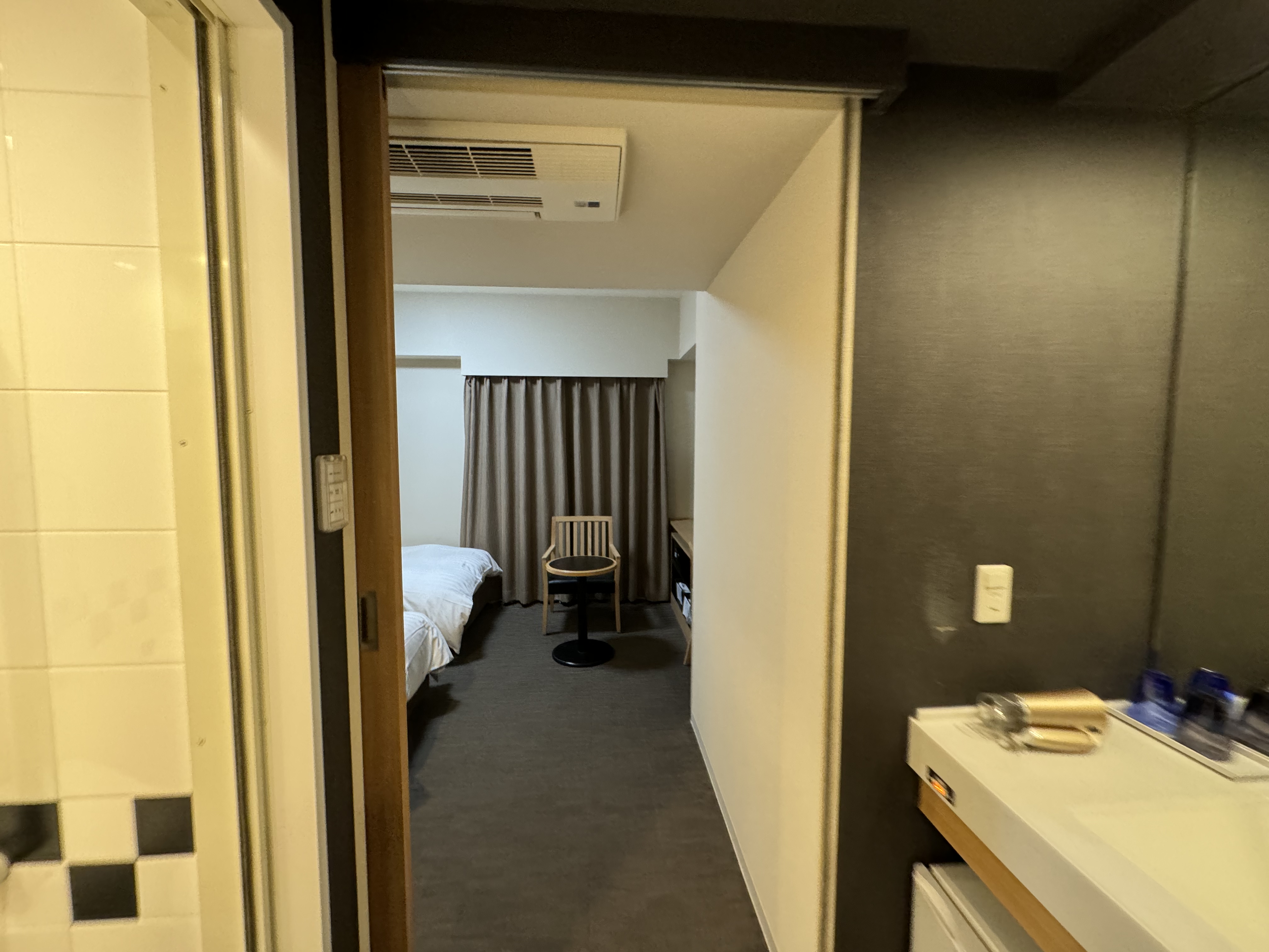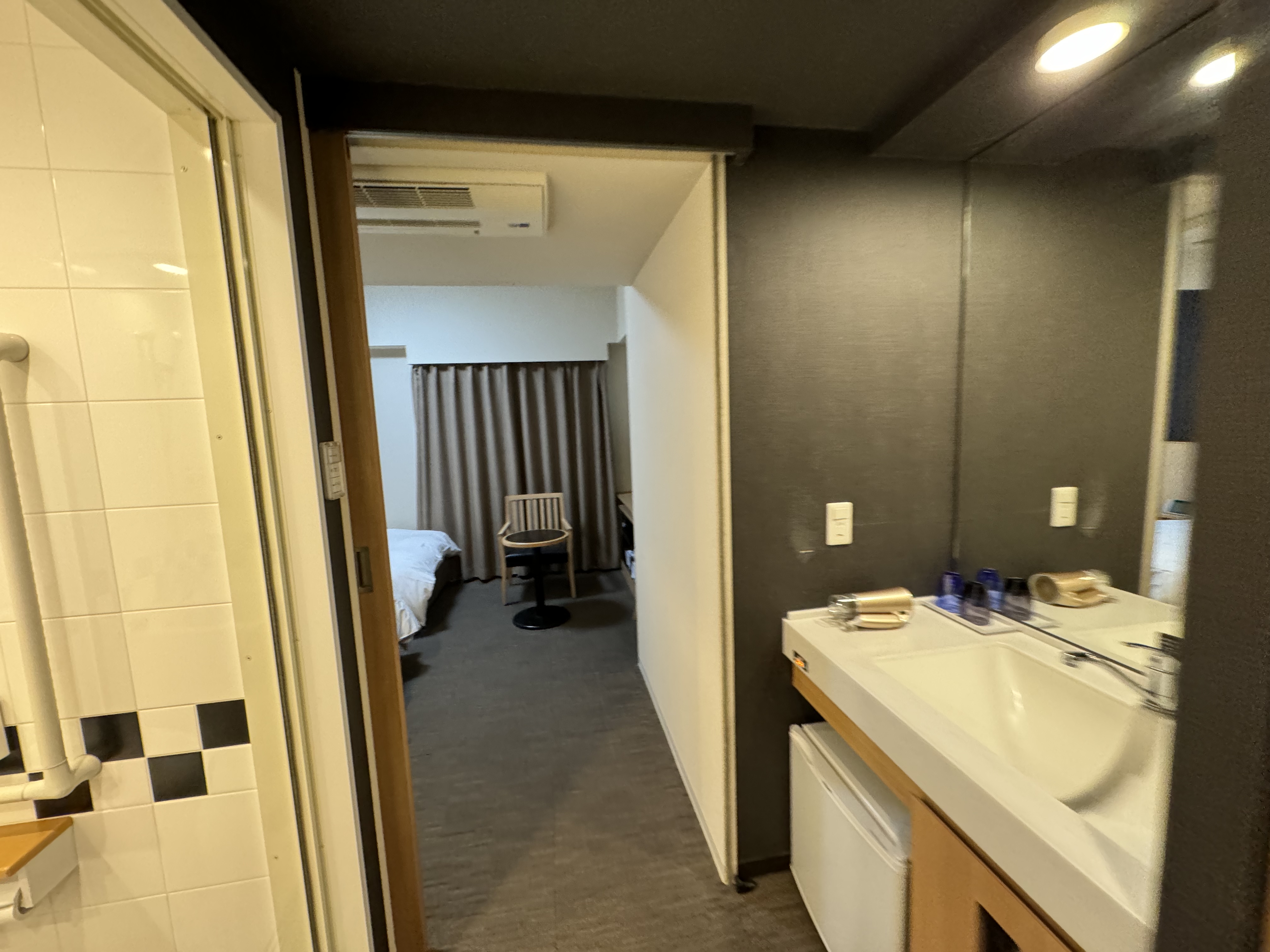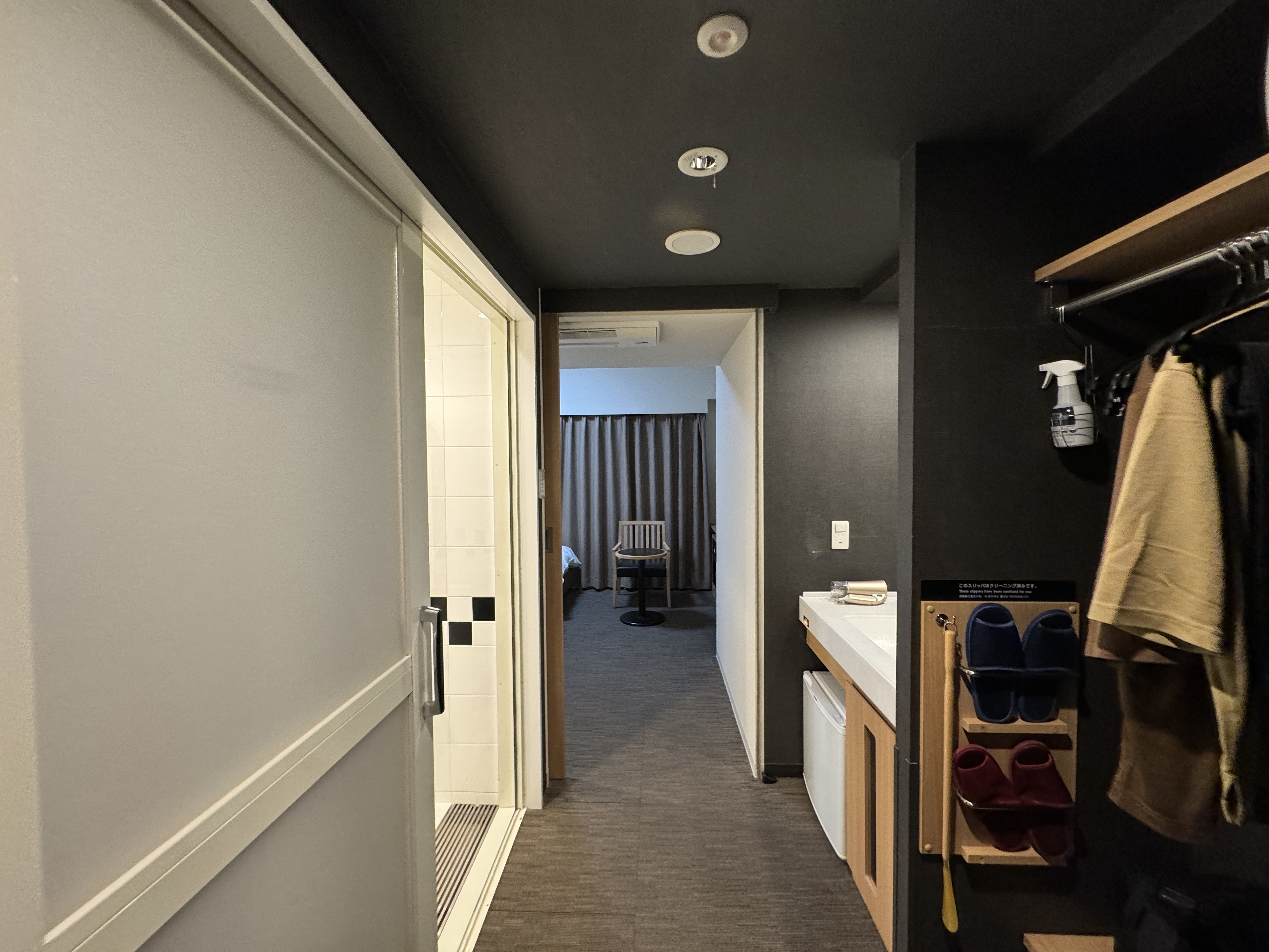 카드를 대고 들어간 객실 은 우측에 옷걸이가 있고, 그다음 세면대~ 그리고 좌측에는 샤워실겸 화장실 이 있고, 그다음은 객실 의 구조 입니다~ 도쿄 여행 다니시다 보면 딱 이런 스타일의 객실을 많이 보실텐데~ 이곳도 큰 차이는 없습니다